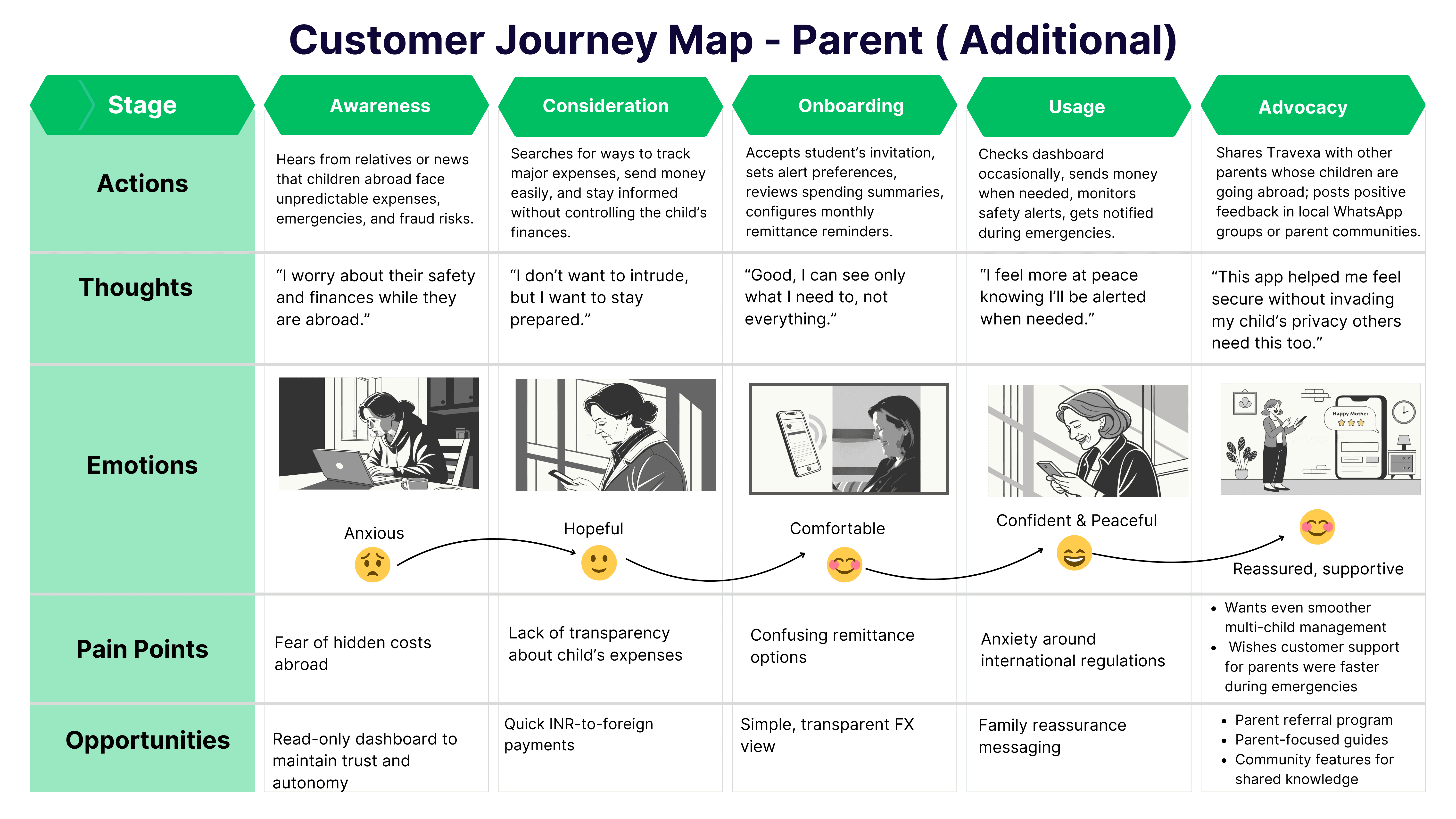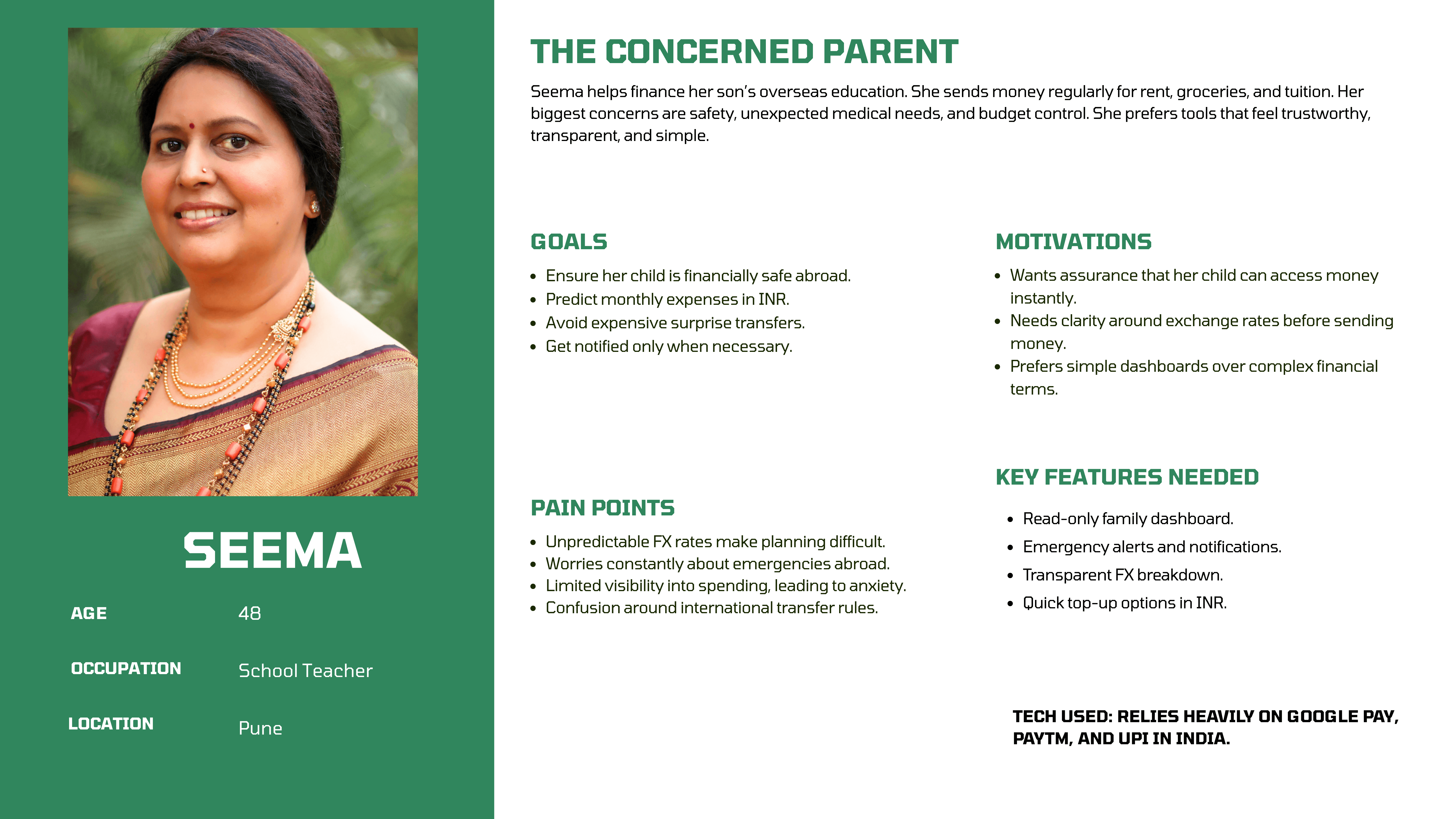 Parents (additional persona) act as reassurance stakeholders. They value predictable INR visibility, emergency alerts, and read-only oversight, focusing on safety and budget clarity rather than daily control.