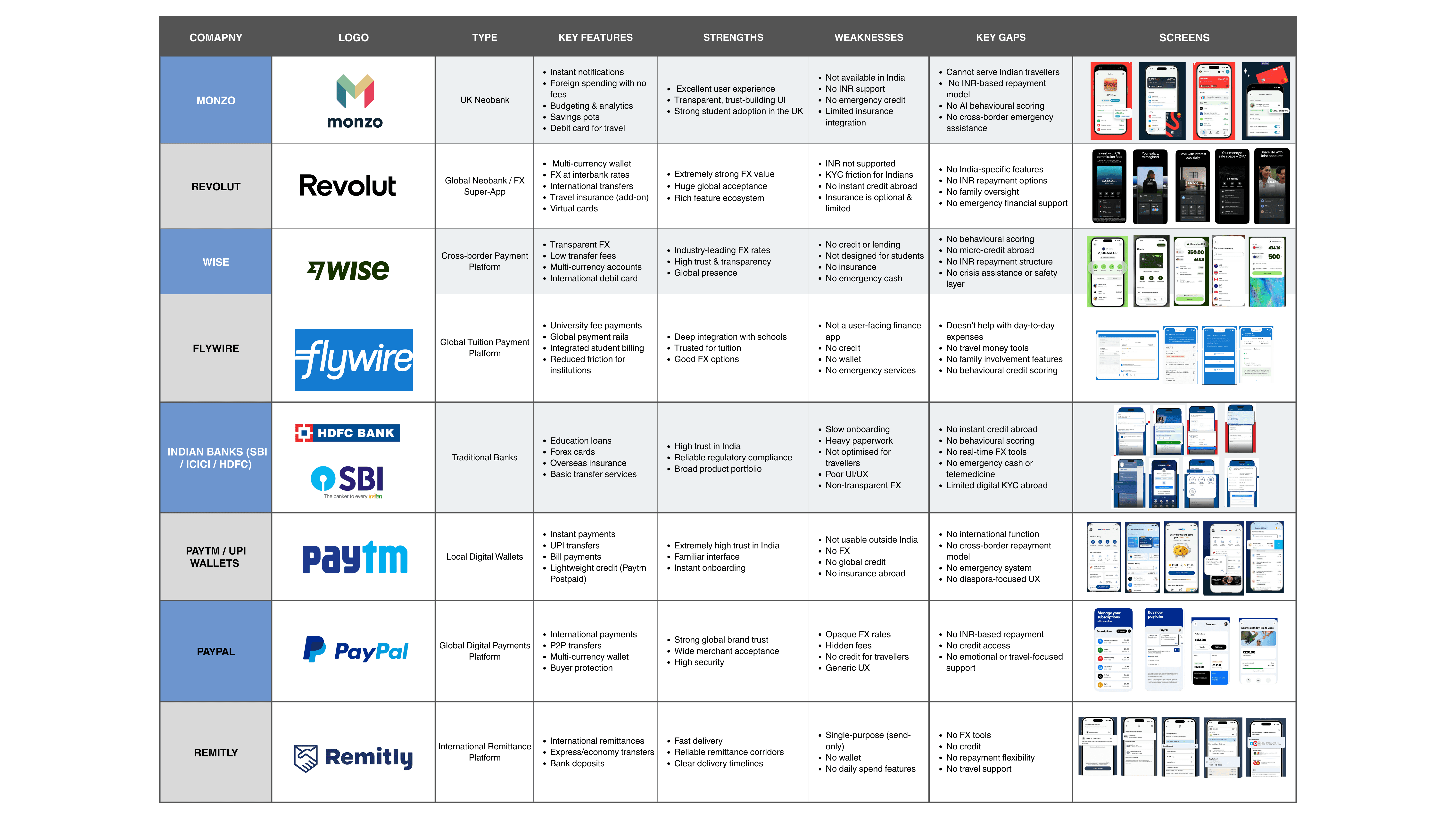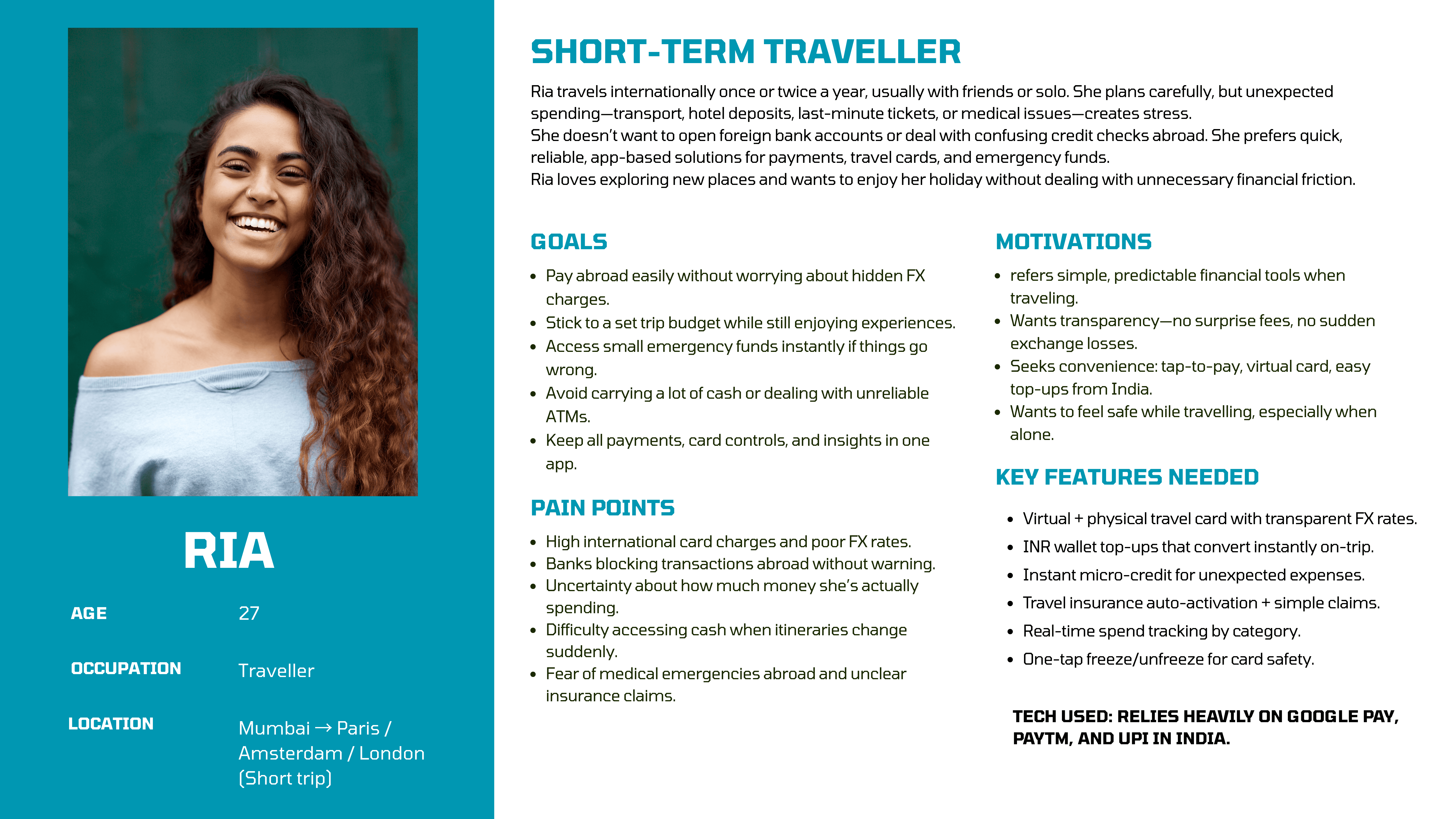 Indian students and travellers face costly, slow, and complex cross-border payments with no instant foreign credit, easy INR repayment or real time emergency support. Existing solutions lack cultural fit and trust, creating a need for a fintech app that leverages India’s digital infrastructure to simplify global spending, borrowing, and protection.