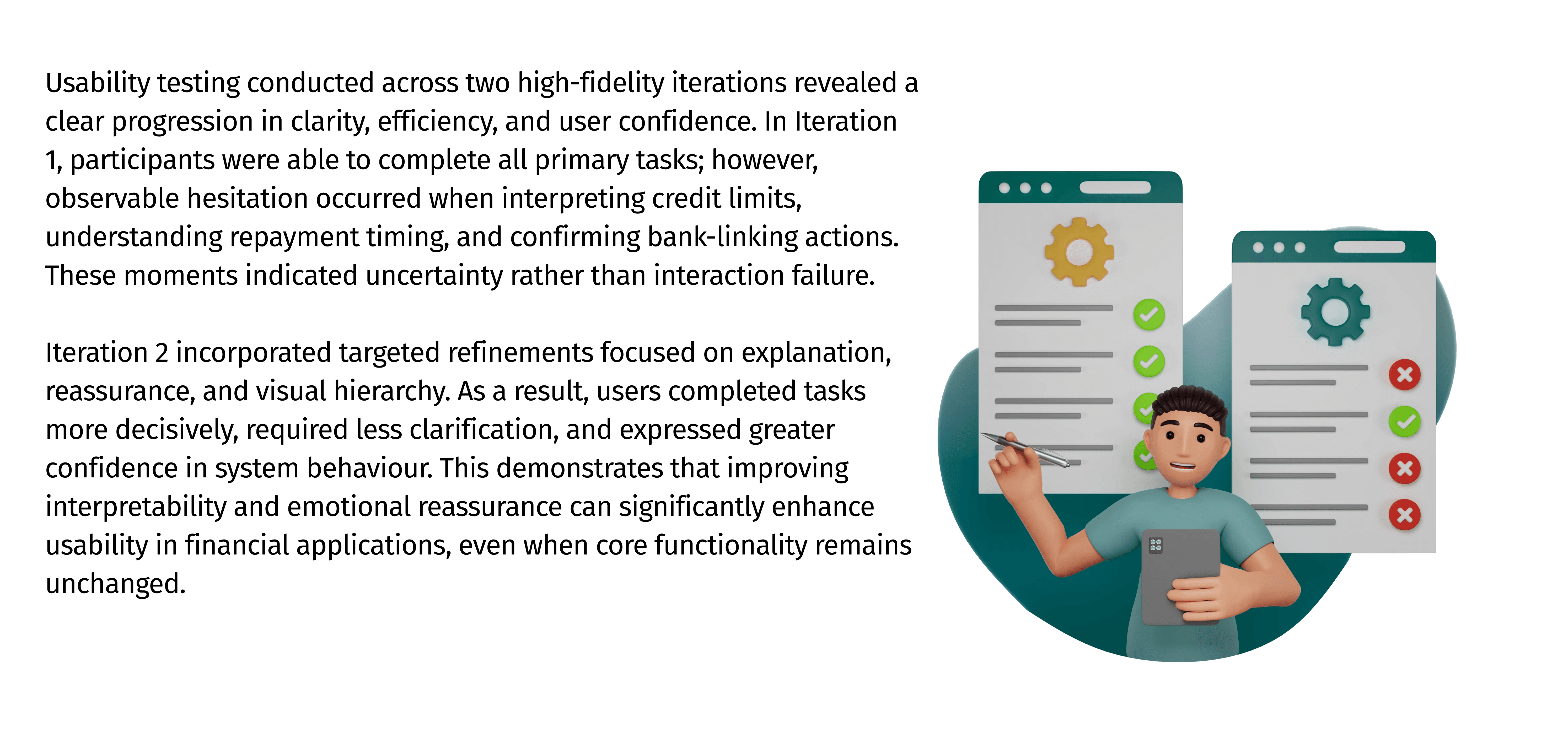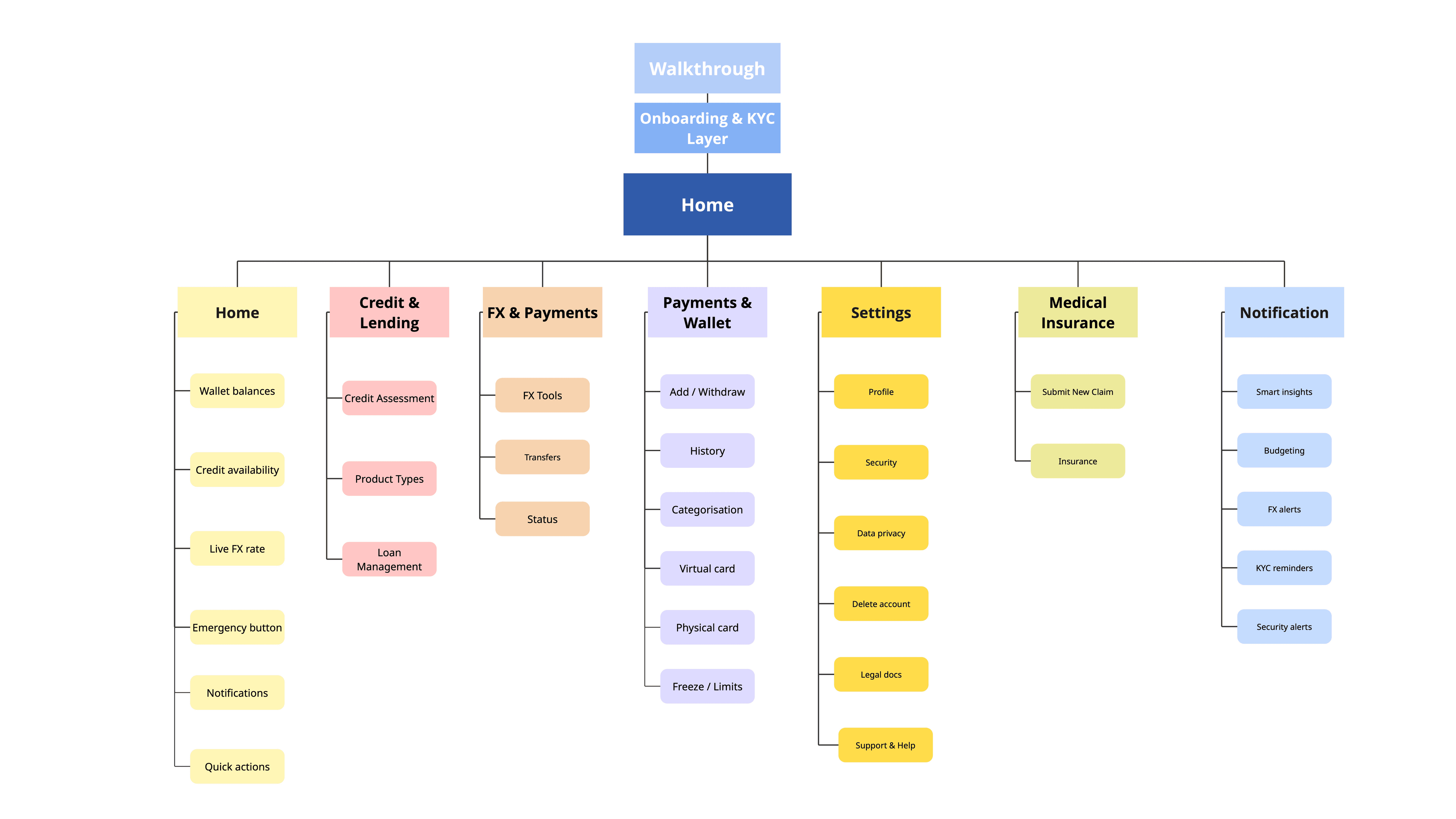 A central Home hub provides quick access to balances, credit, FX rates, and emergencies, with clear separation between credit, payments, wallet, insurance, and settings to keep high-priority tasks fast and easy while reducing cognitive load.