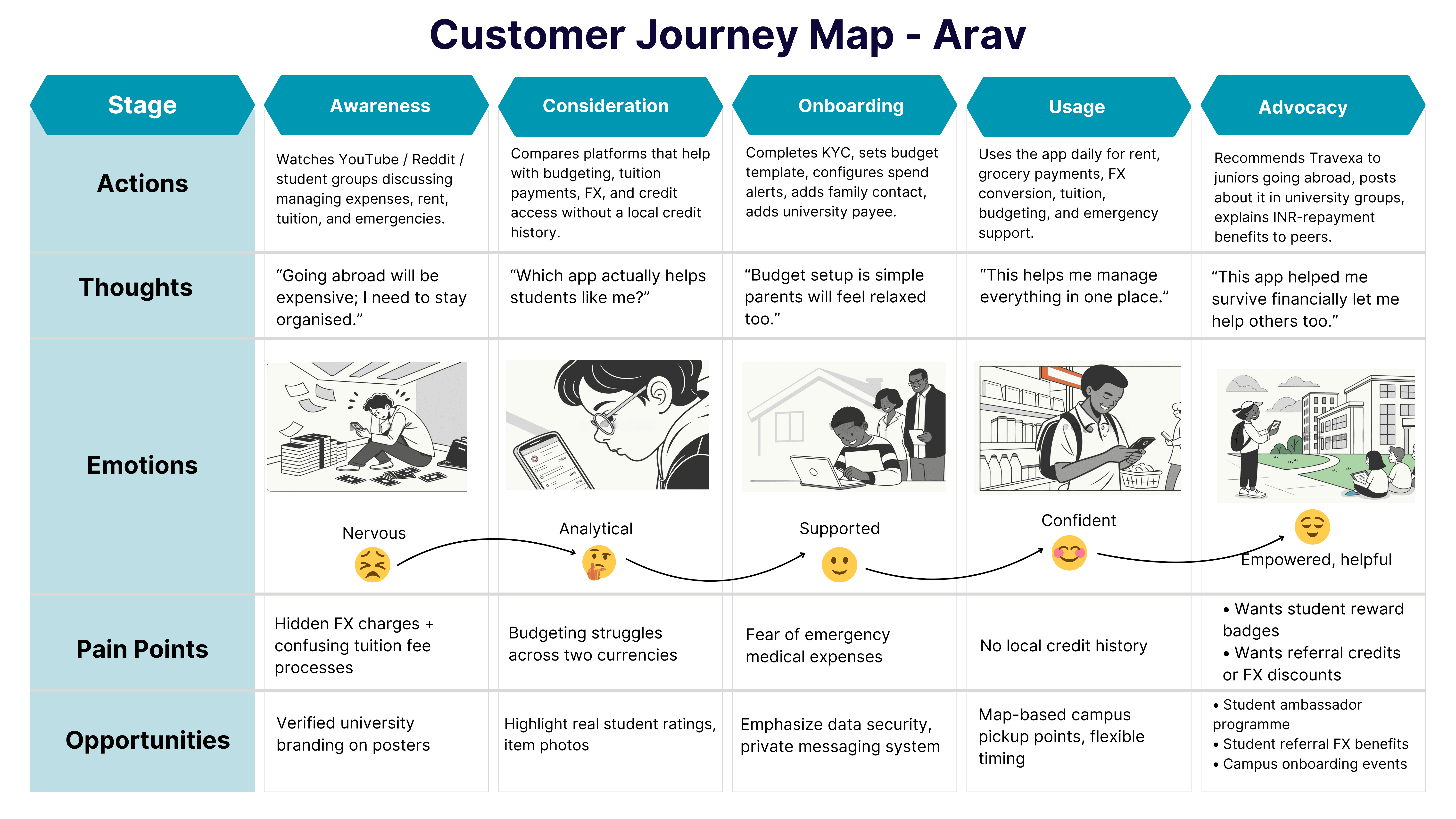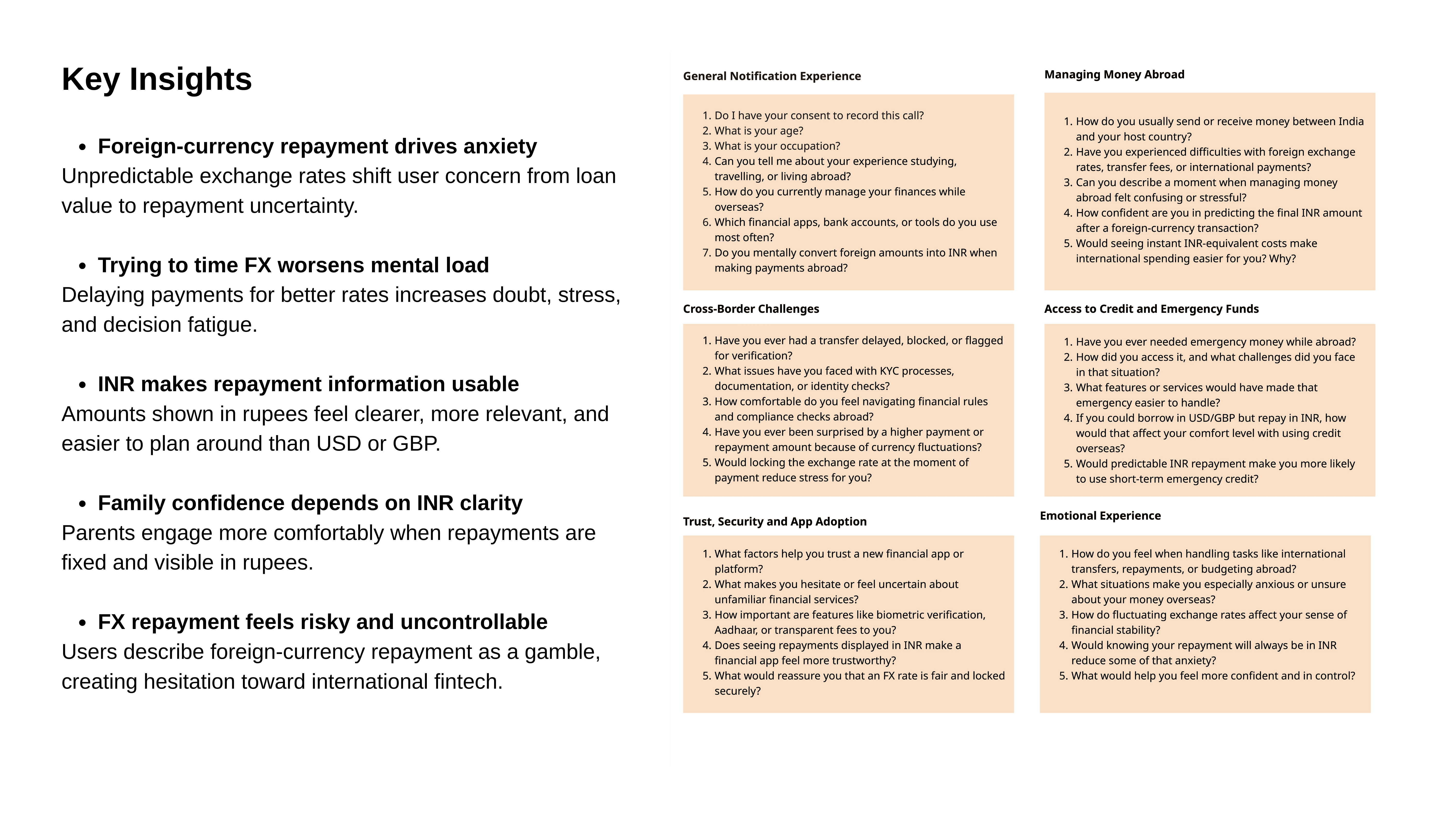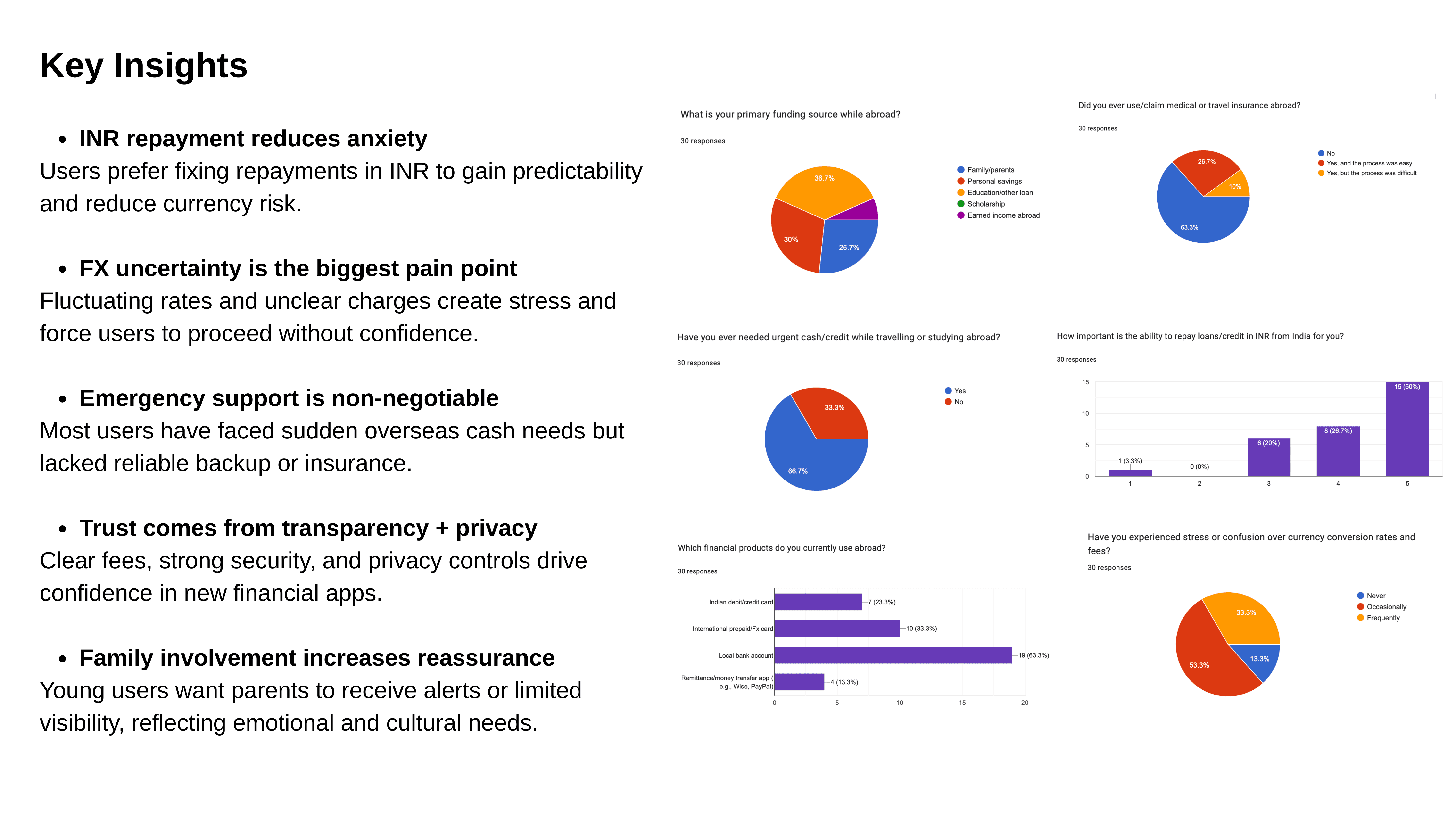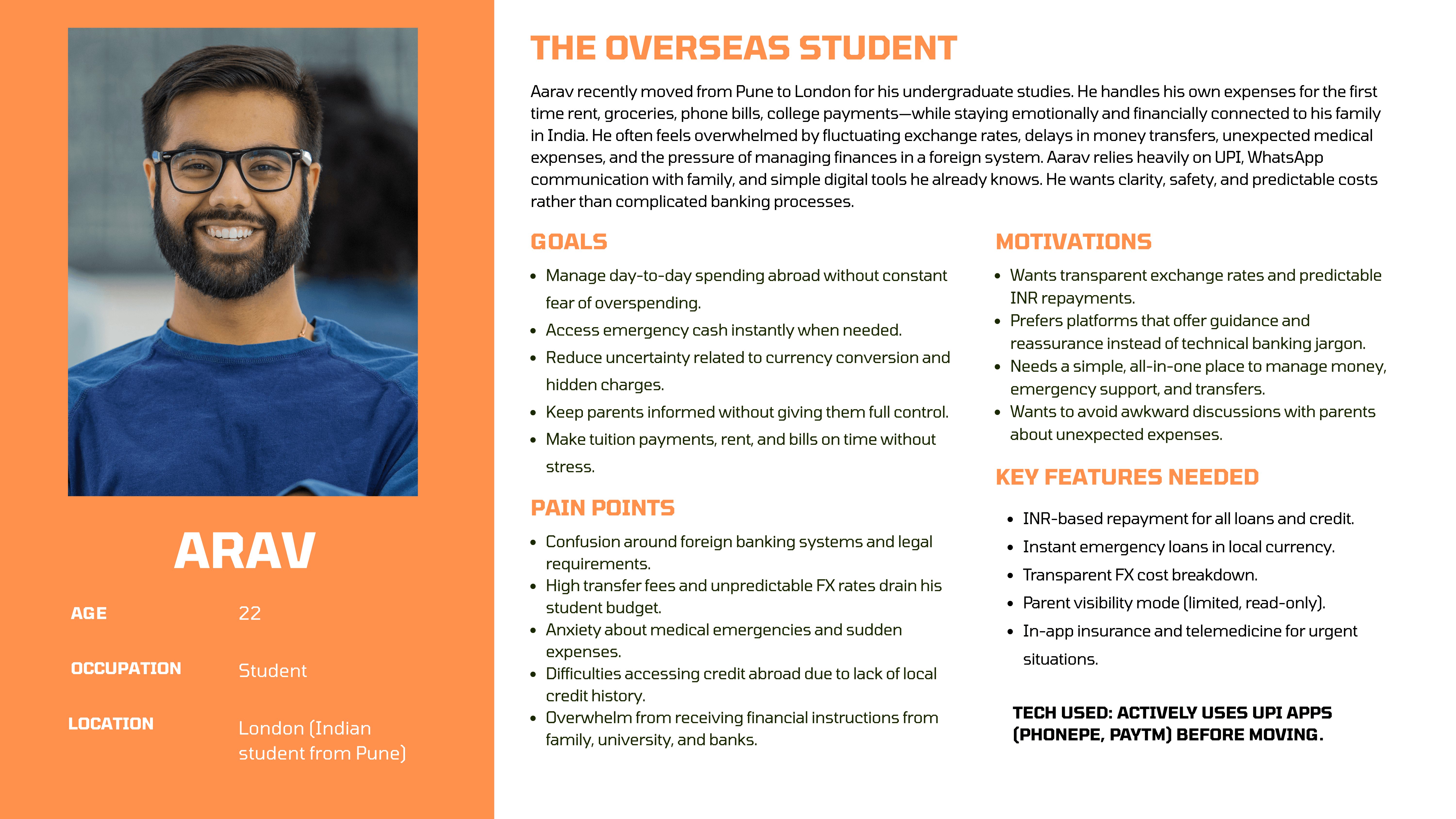 Students manage overseas expenses independently for the first time and feel stressed by FX volatility, unclear fees, and emergencies. They need INR-based repayments, fast onboarding, emergency support, and family reassurance without losing autonomy.