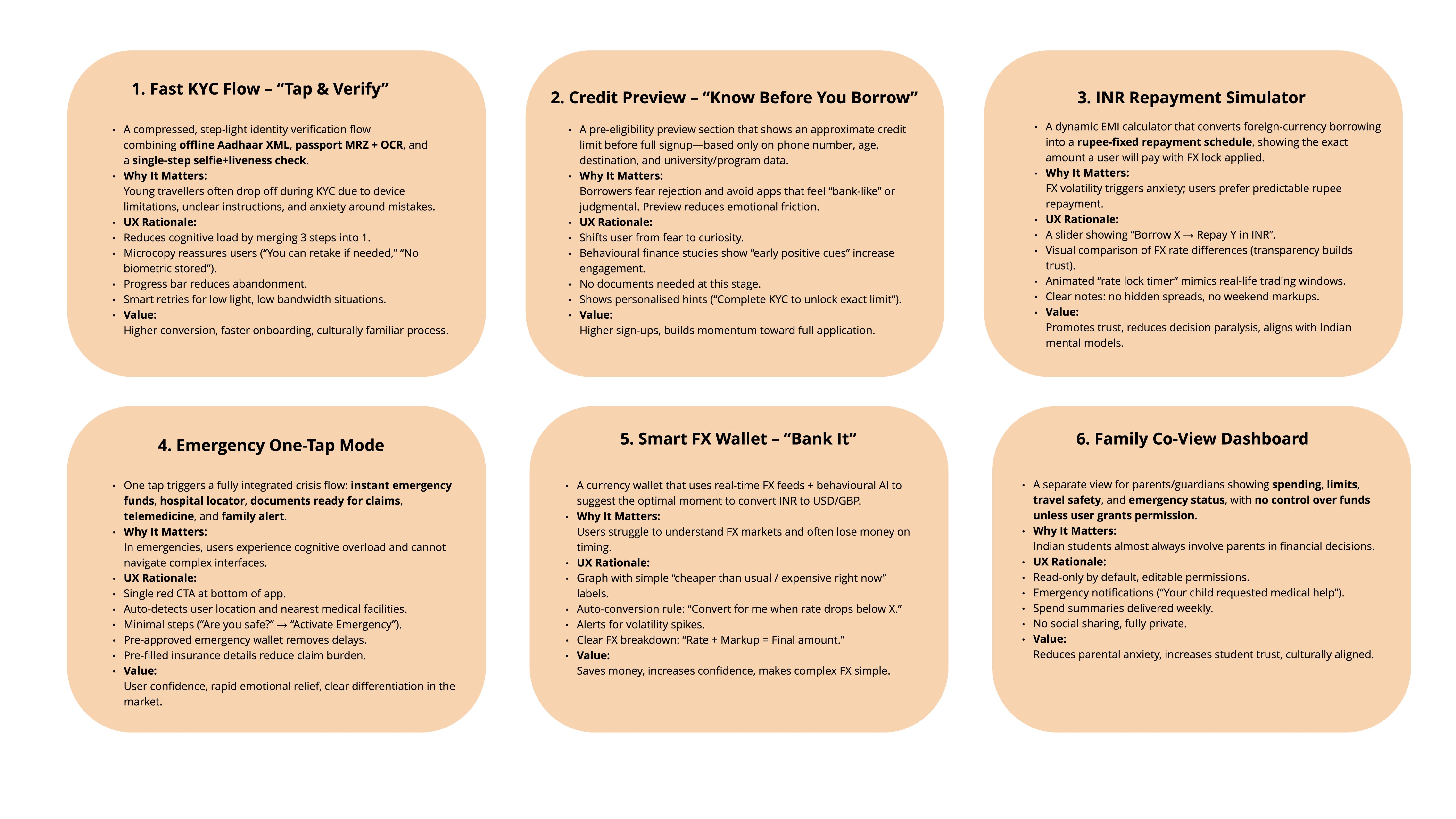 Primary Features: These are the essential functionalities that the app cannot operate without, such as the INR-based repayment, instant credit access, fast KYC, transparent FX, and emergency support.