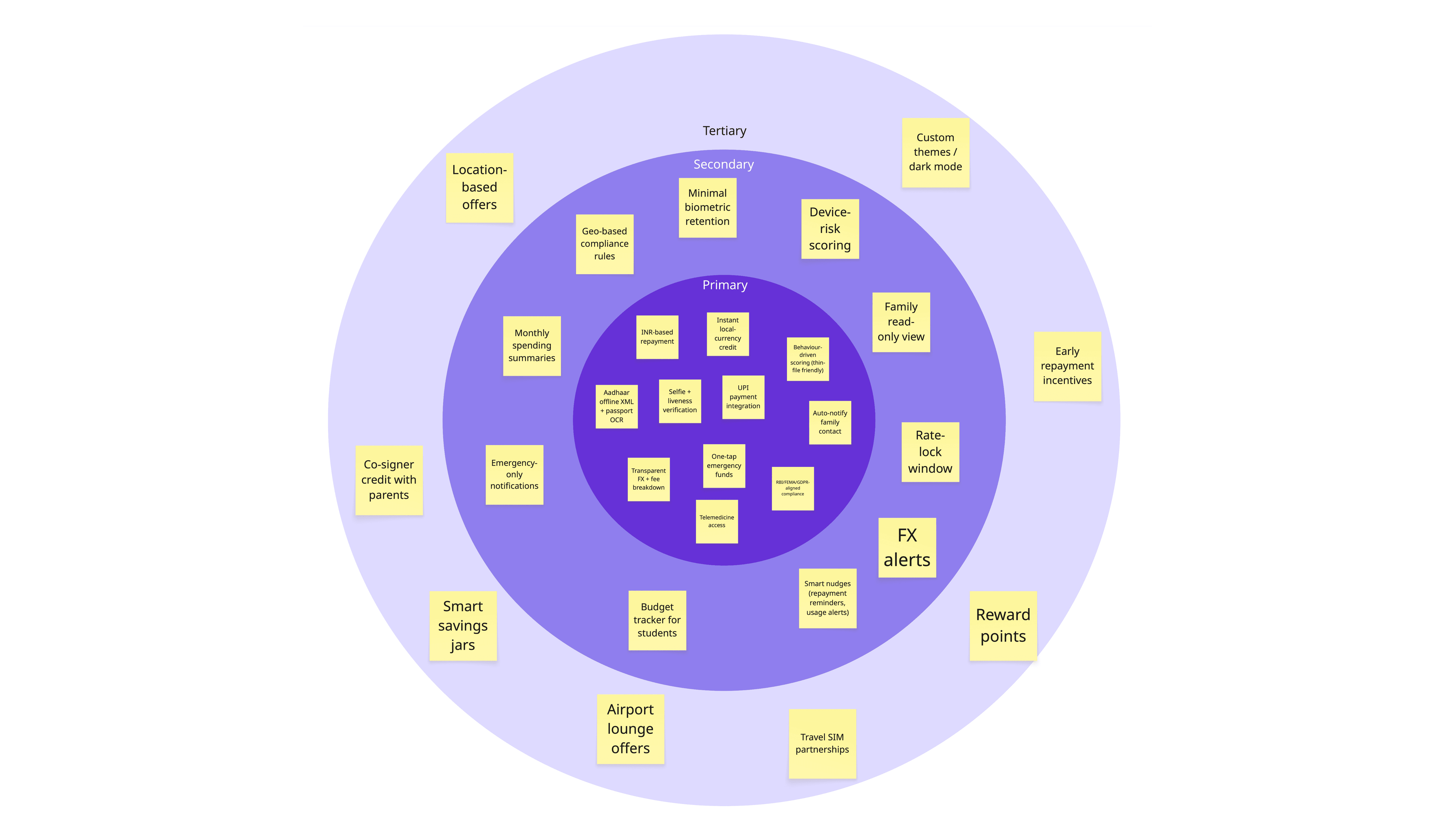 Secondary Features: These features significantly improve the user experience and enhance the core features, but they are not required for the app to function at a basic level. Features like enhance trust and usability through family visibility, FX alerts, budgeting tools, and security controls.