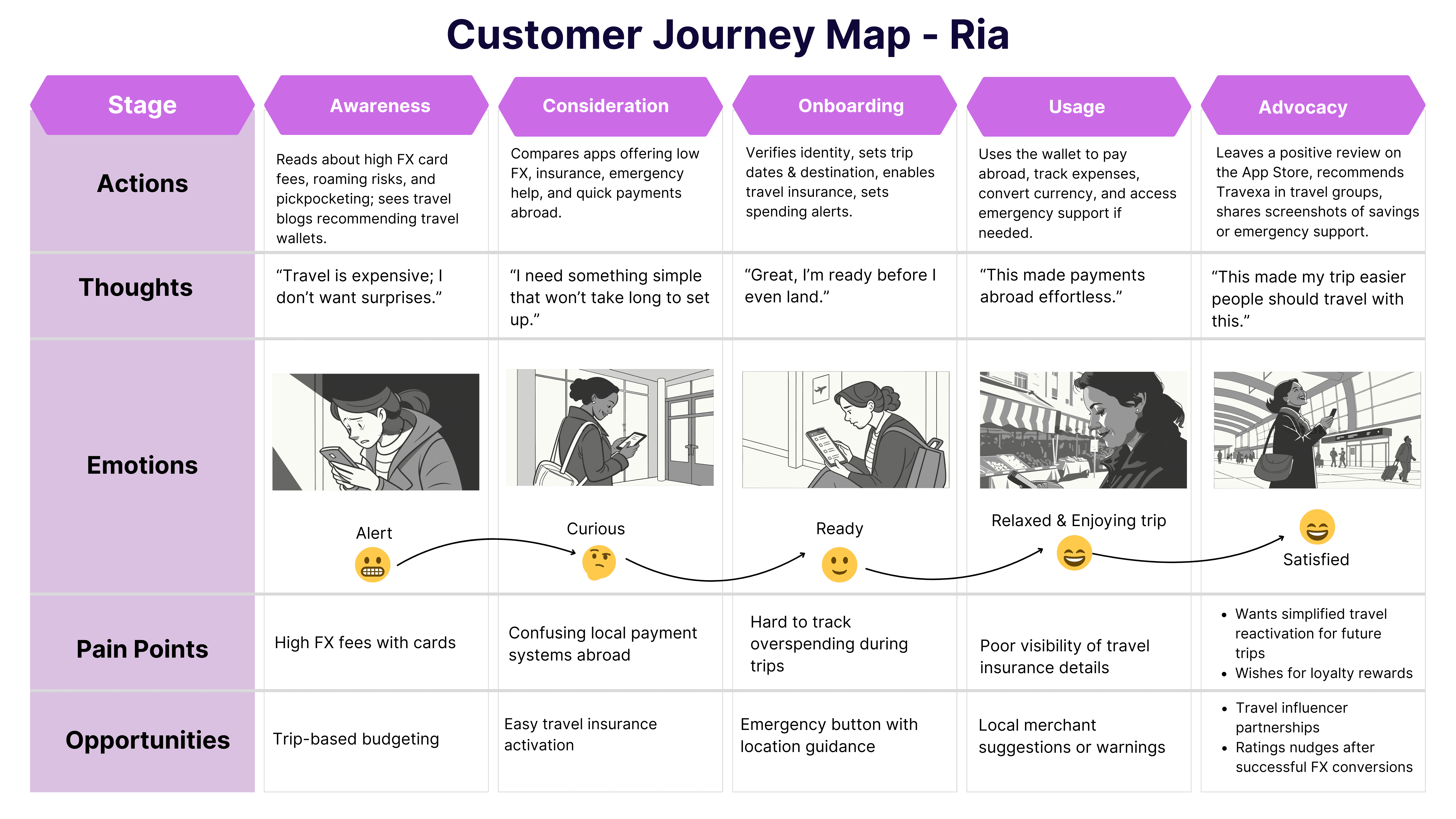 Customer journey maps illustrate how users experience Travexa from first discovery to ongoing use. They highlight user actions, thoughts, emotions, and pain points at each stage, making it easier to identify patterns and opportunities for improvement across the entire journey.