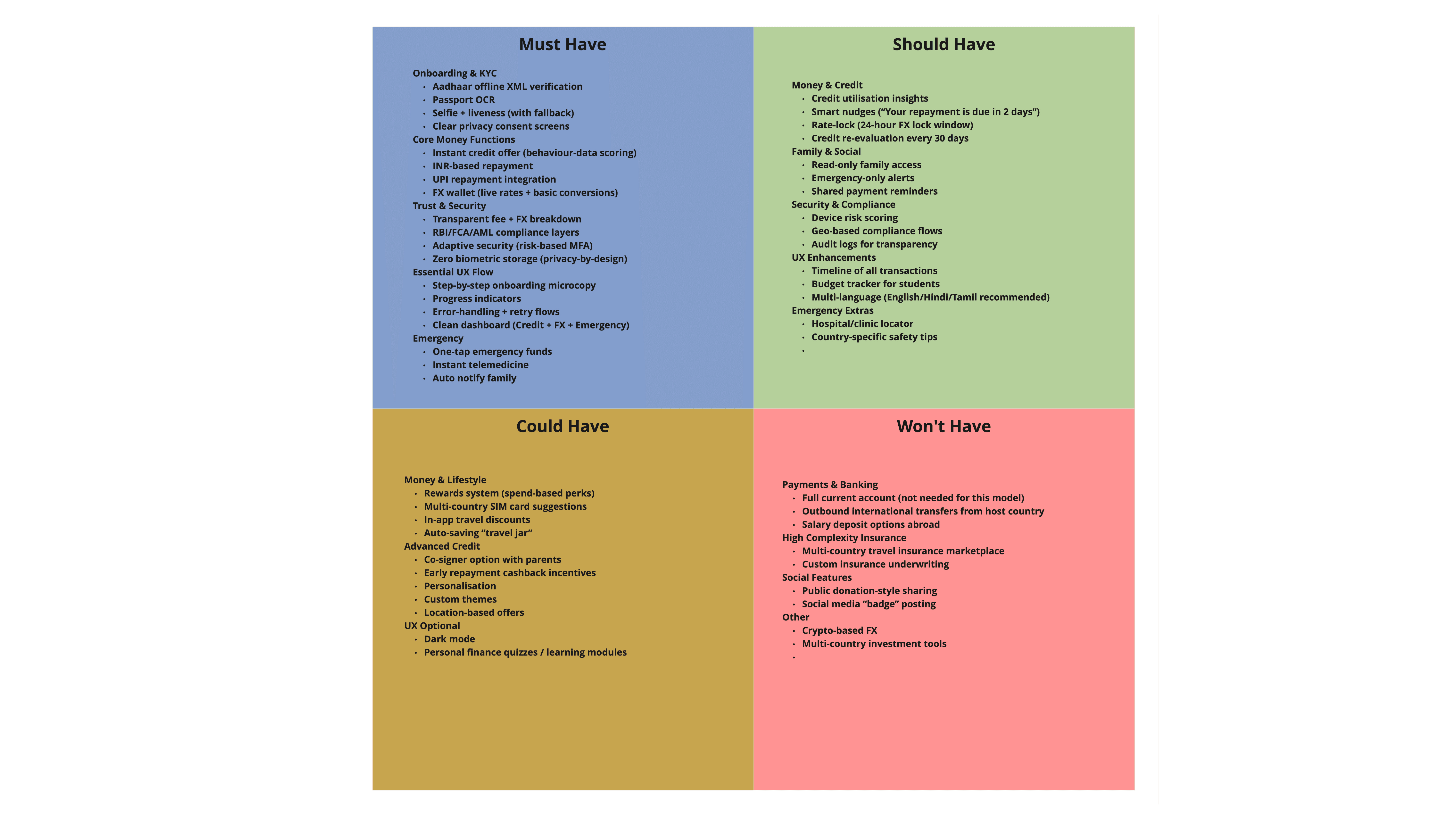 The MoSCoW framework was used to focus the MVP on features that reduce stress and build trust. Core priorities include fast KYC, INR-based repayment, transparent FX, and emergency support, as these were consistently validated through research.