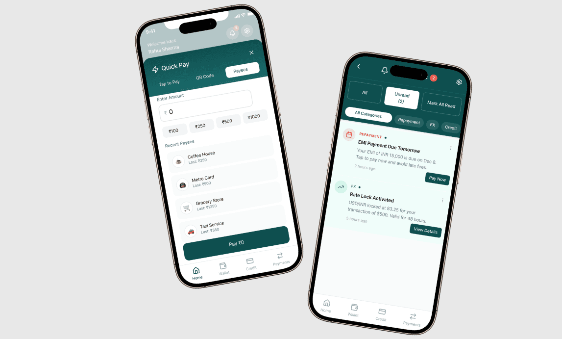 Design a user centric fintech app offering instant USD/GBP Credit, INR repayment and embedded emergency insurance